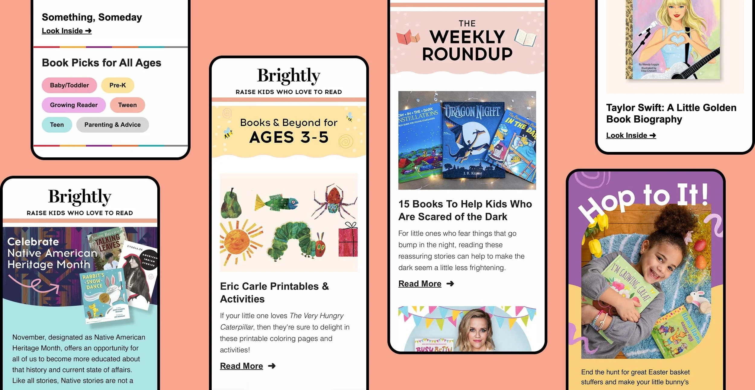 Brightly promotes age/stage-specific content each month through subscriber emails and on-site articles. These themes are promoted via email marketing, on-site editorial, and social media. A visual narrative was crafted for each campaign, using props and models to bring the books to life.