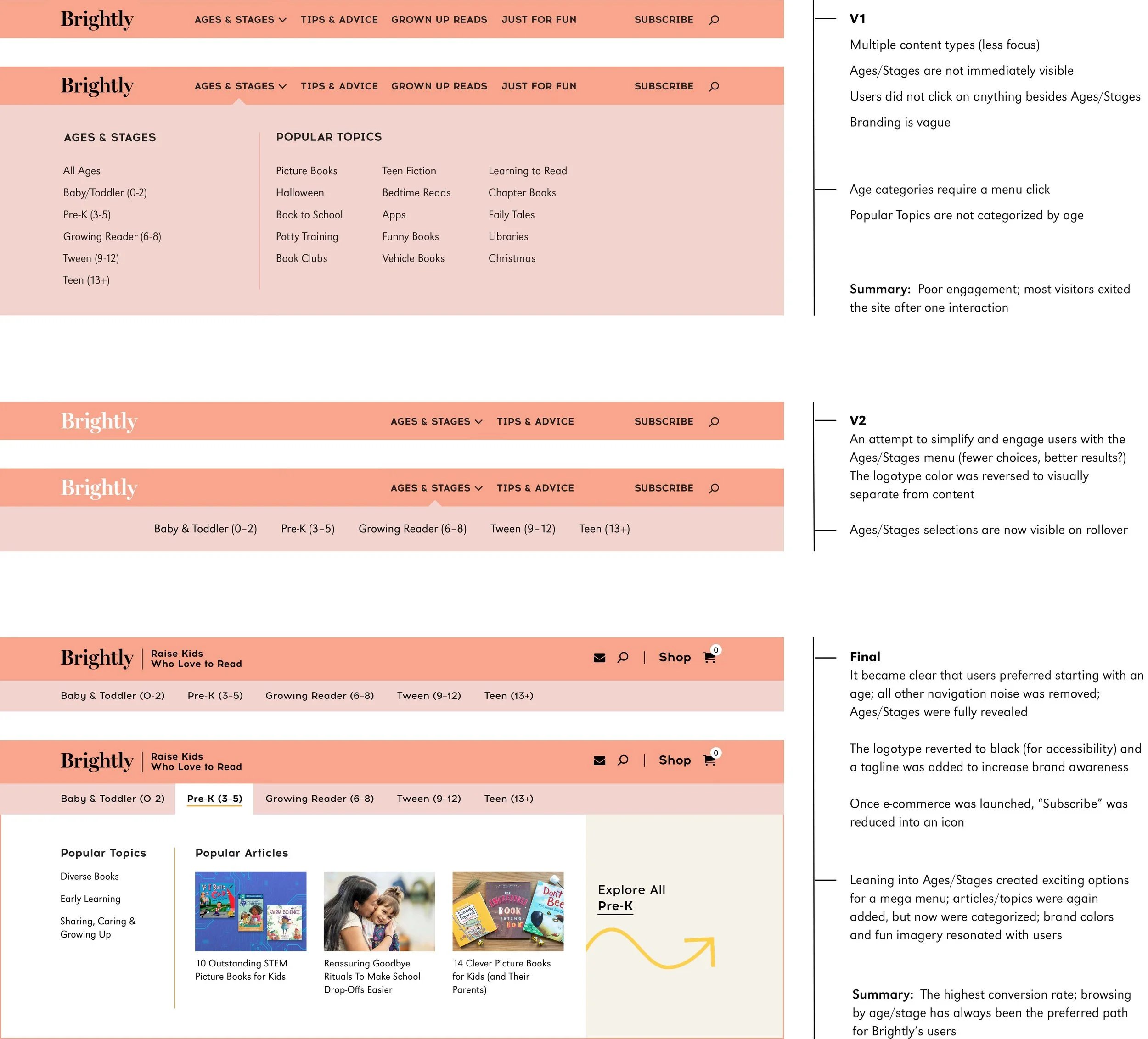 Exposing navigation improved engagement but did not show the range of Brightly’s content; Tips & Advice had low click rates.