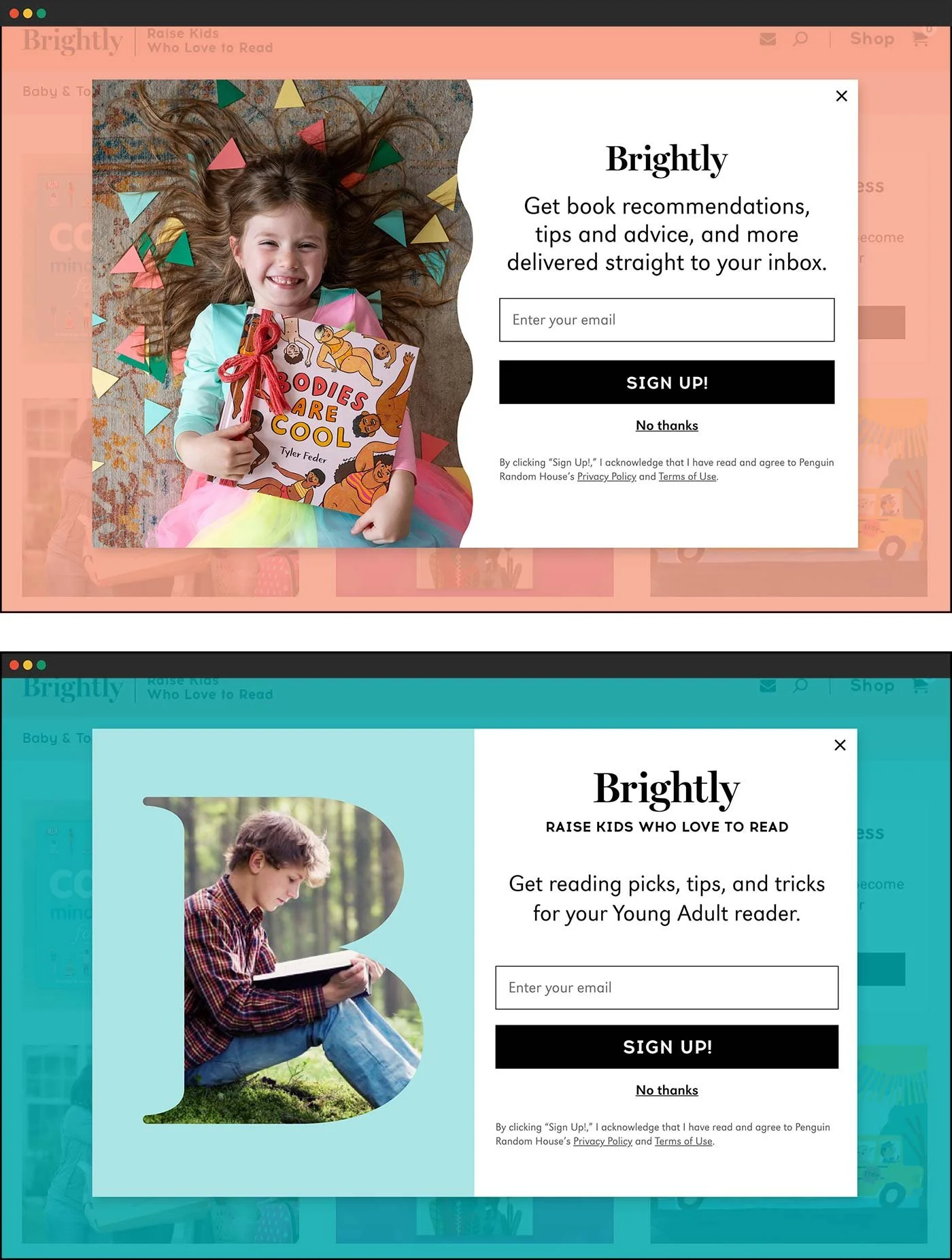 Contextual takeovers make it easy for Brightly users to subscribe to newsletters and receive content relevant to their lives. Each type of email capture aligns with user behavior, and the art is customizable within WordPress to ensure a consistent UX with Brightly’s branding.